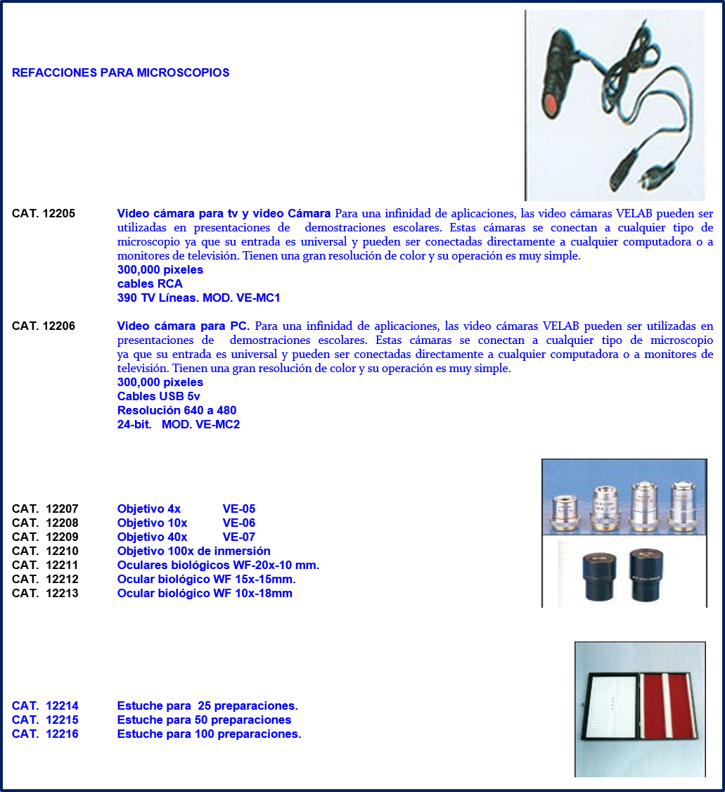 REFACCIONES PARA MICROSCOPIOS. Video cámara para tv y video Cámara Para una infinidad de aplicaciones, las video cámaras VELAB pueden ser utilizadas en presentaciones de demostraciones escolares. Es